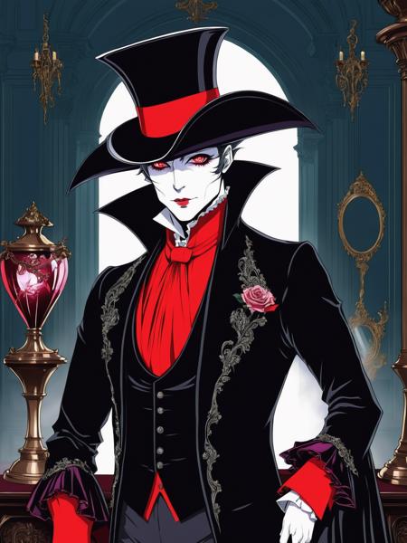 - text: "graphical anime portrait of A charming vampire aristocrat, clad in opulent Victorian attire:1.3, in a lavish gothic mansion:1.3, with hypnotic crimson eyes:1.3, an air of sophistication:1.3, and a thirst for blood:1.3., Neon , "
