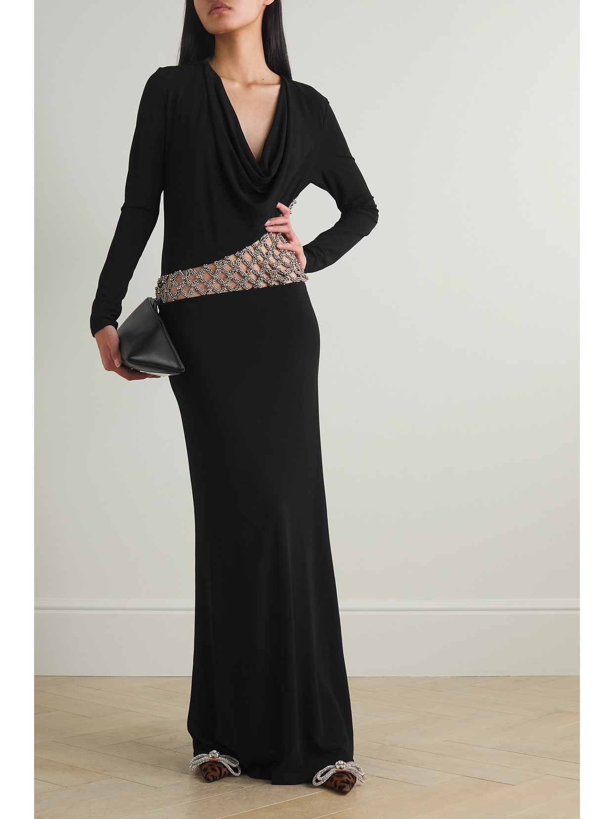Embellished draped crepe maxi dress