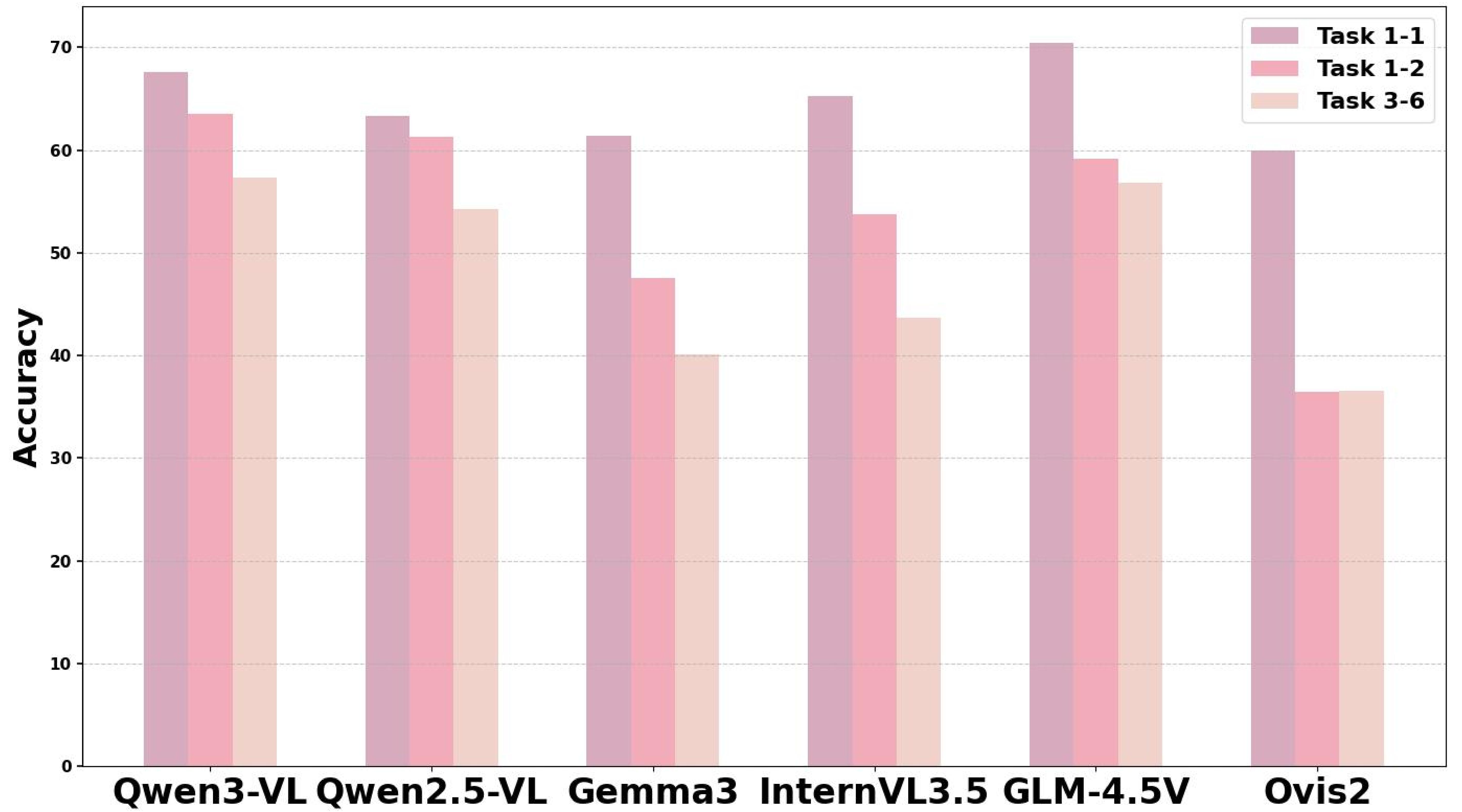 Task abbreviations: Task1-1 (Image Understanding), Task1-2 (Video Understanding), and Task3-6 (Next-Action Prediction from Video Sequences and Current Visual State).