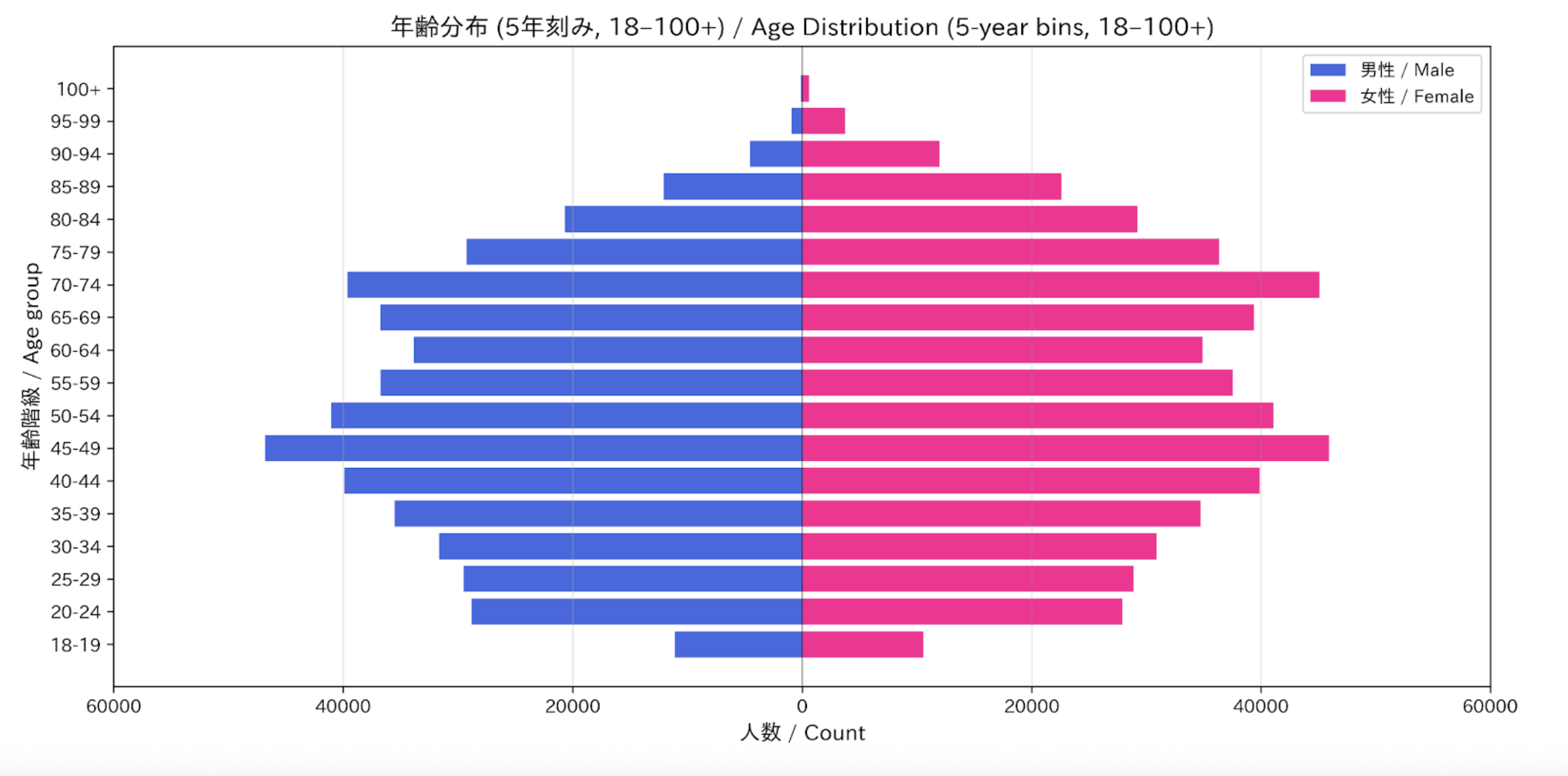 The age distribution of our Japanese personas mirrors the country's real demographic structure, characterized by a large proportion of people in the middle to older age groups and a gradual decline toward the younger cohorts. The distribution shows fewer young people and a significant expansion in the generations born during the baby boom and the second baby boom. Furthermore, Japanese women are exceptionally long-lived by global standards, and the proportion of women among the elderly is high.