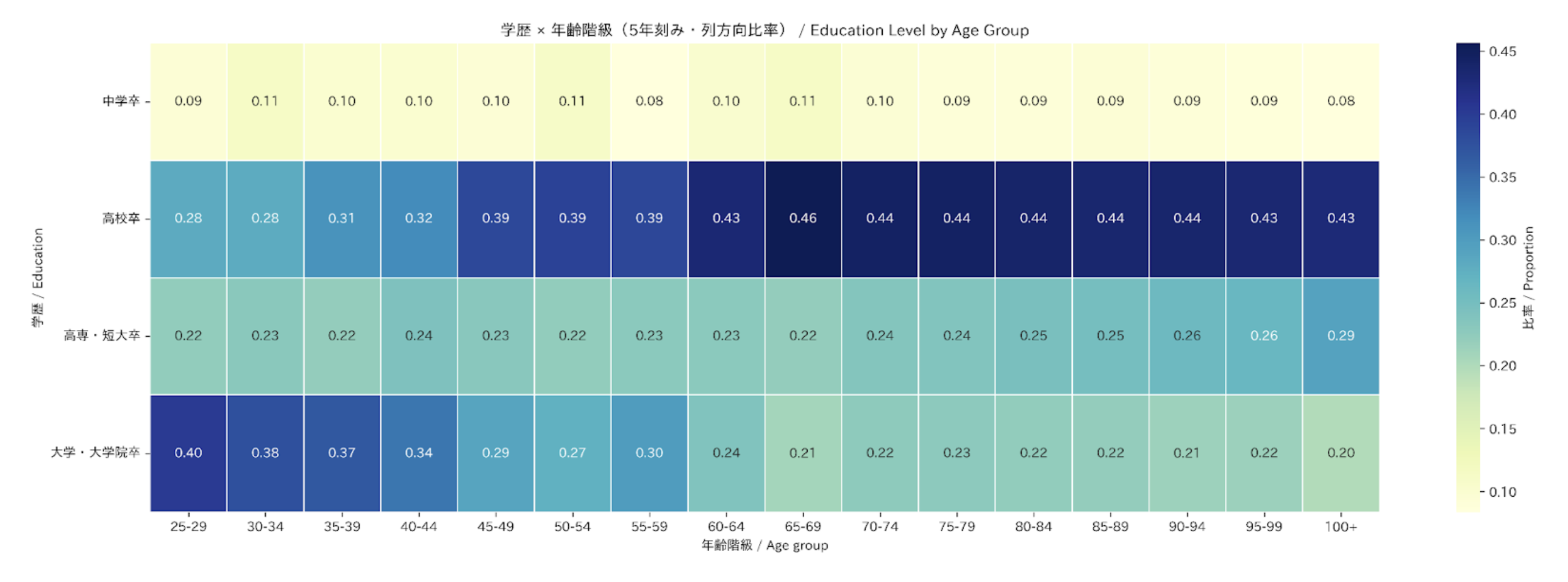 以下のヒートマップは、年齢層ごとの学歴達成のパターンを示しています。たとえば、学士号、修士号、博士号を取得している人の割合は、若い世代と高齢世代とで異なっており、教育機会へのアクセスや社会規範の歴史的な変化を反映しています。