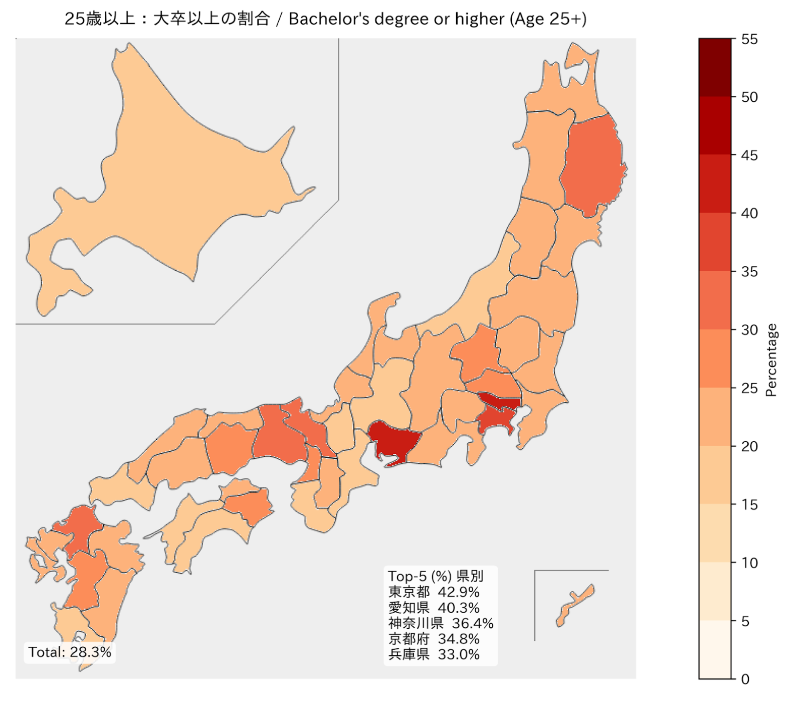 This slice of our dataset demonstrates how geography informs education and therefore persona descriptions. The choropleth map shows, for each prefecture, the share of residents ages 25 and older who hold at least a bachelor's degree. No LLM in our testing was able to generate data of this fidelity.