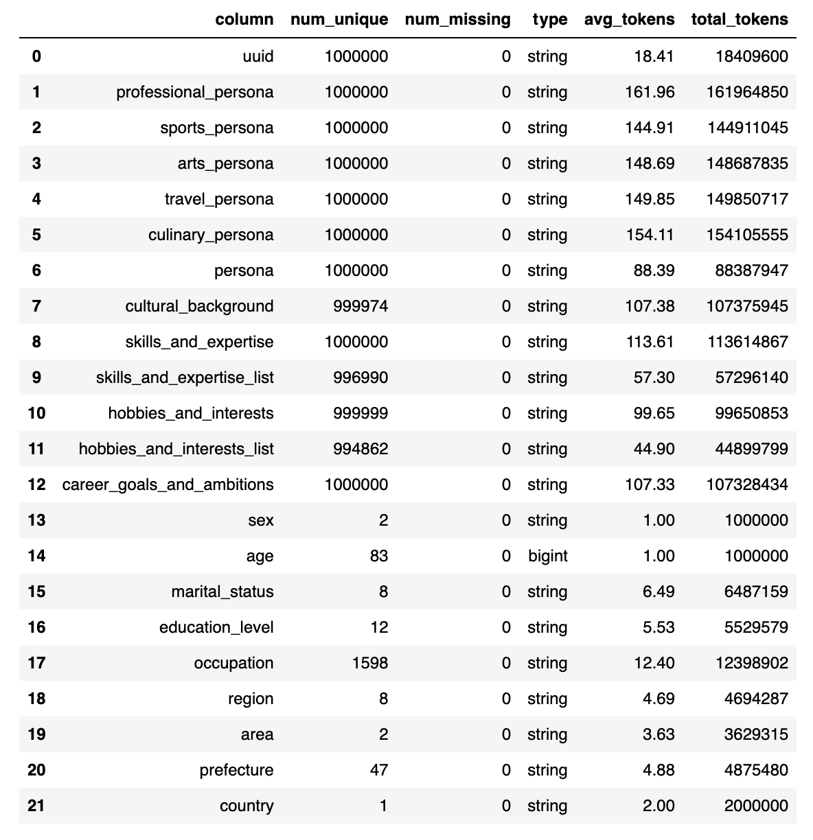 1.4B tokens (850 persona tokens) across 1M records and 22 columns, excluding the globally unique identifier. Note that data covers all 47 prefectures in Japan.
