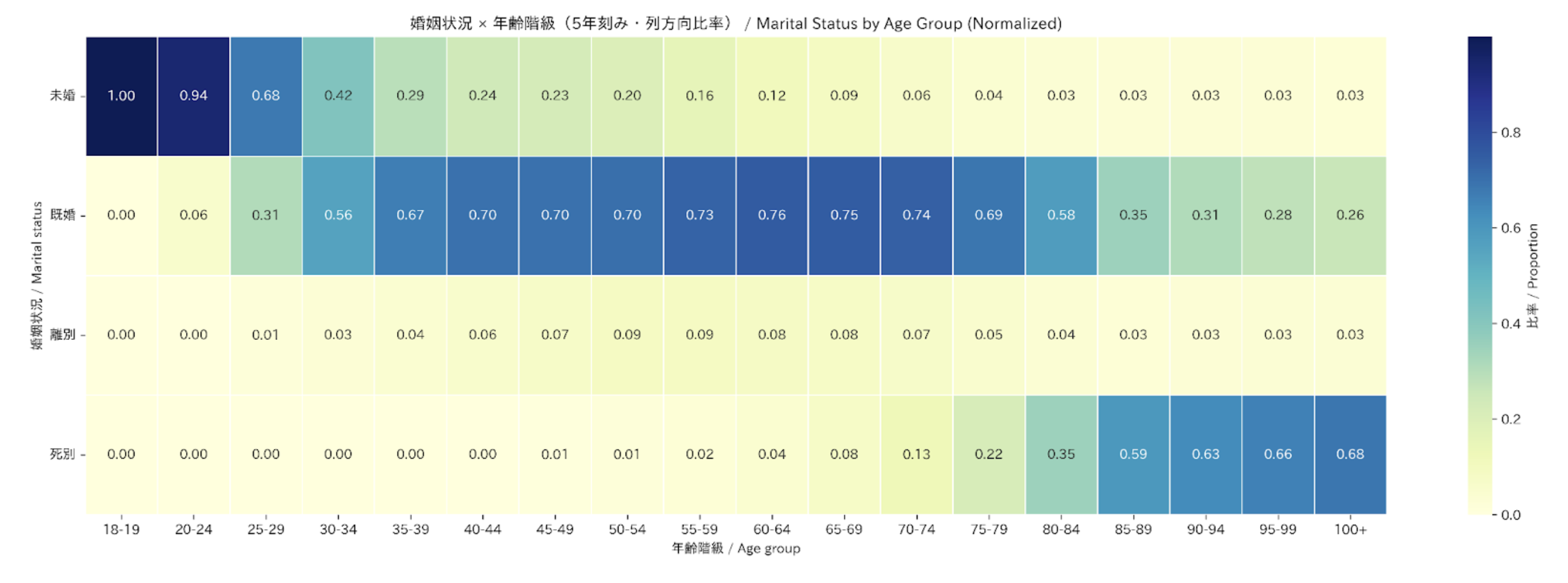 以下のヒートマップは、各年齢層における人々の割合を示しており、(1) 未婚、(2) 既婚、(3) 離婚、(4) 死別 の4つに分類しています。日本においては、人生の過程に沿って婚姻状況がどのように変化していくかが表れており、30代半ばまでは「未婚」が優勢ですが、その後「既婚」が徐々に増加し、「離婚」はほぼ横ばい、「死別」は高齢期に入って顕著になります。これらの要素はいずれも、日本のライフスタイルやペルソナを理解するうえで重要な示唆を与えます。