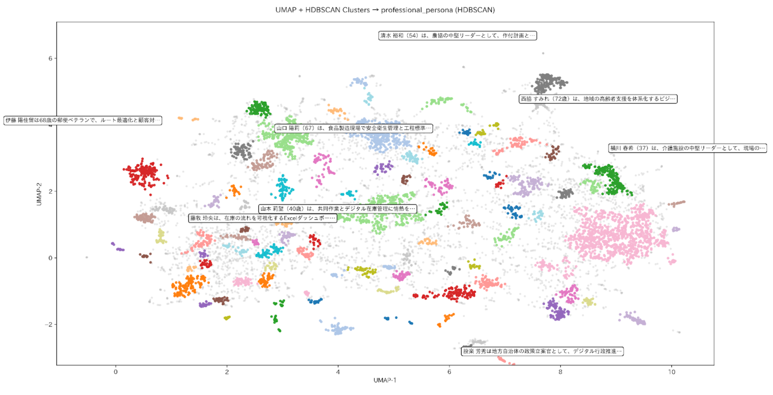 The attributes above (and many more) ultimately affect the diversity of the synthetic personas being generated. As an example, the analysis below highlights a multitude of clusters within professional persona descriptions. These clusters are identified by clustering embeddings and reducing dimensionality to 2D.