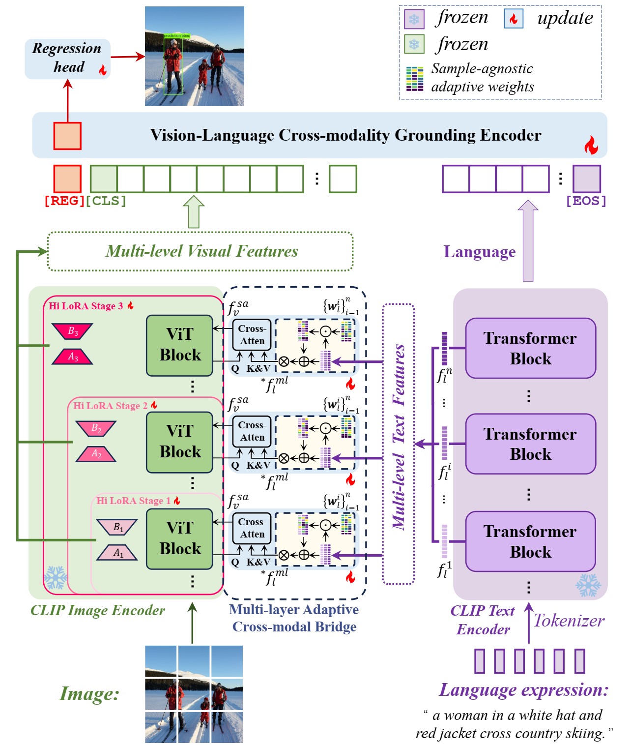 - A concise hierarchical multimodal modulation framework, which utilizes the hierarchical structure to gradually adapt CLIP to grounding. HiVG achieves fine-grained interaction between multi-level visual representations and language semantics, and significantly alleviates the task gap between CLIP and grounding.