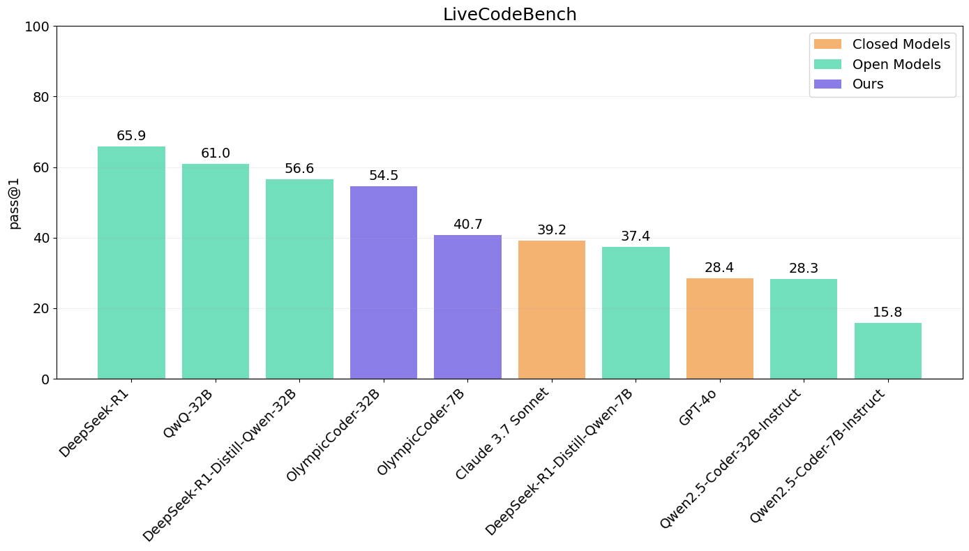 The OlympicCoder models were post-trained exclusively on C++ solutions generated by DeepSeek-R1. As a result the performance on LiveCodeBench should be considered to be partially out-of-domain, since this expects models to output solutions in Python.