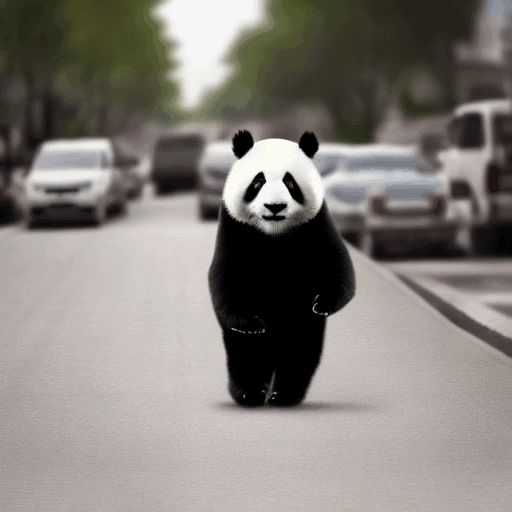 | "A horse galloping on a street" | "A panda walking alone down the street" | "A dog is walking down the street" | "An astronaut is waving his hands on the moon" |