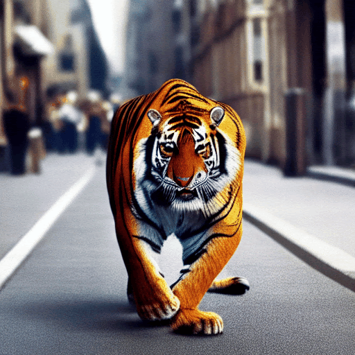 | "A tiger walking alone down the street" | "A panda surfing on a wakeboard" | "A horse galloping on a street" | "A cute cat running in a beatiful meadow" |